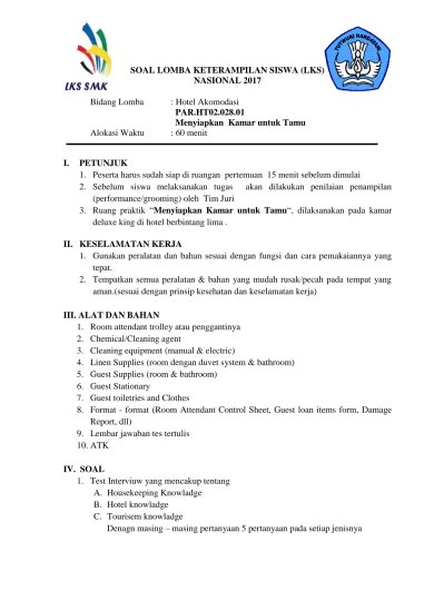 Kisi Kisi Soal Housekeeping / Latihan Soal Tentang Kebersihan Kamar Tamu Prepare Room For Guest - Peralatan pembersih manual yang dipergunakan untuk membersihkan pintu atau dinding yang terbuat dari kaca adalah …. Kisi kisi soal housekeeping, soal dan jawaban akomodasi perhotelan, soal ujian sekolah housekeeping, kunci jawaban lks housekeeping. Peralatan pembersih manual yang dipergunakan untuk membersihkan pintu atau dinding yang terbuat dari kaca adalah … Du suchst nach einem job im housekeeping, in der reinigung oder hauswirtschaft? Finde auf hotelcareer deinen passenden job und bewirb dich direkt online. No m no materi indkator or