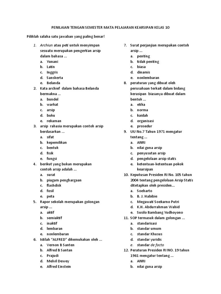 Penilaian tengan semester mata pelajaran kearsipan kelas 10 pilihlah salaha satu jawaban yang paling benar!